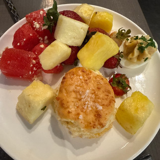 Breakfast – Ale & Compass: Crab Cake Benedict, assorted fruit, biscuits, deviled eggs, continental enhancements, pastries, Peach Bellini, AND a Diet Coke.